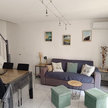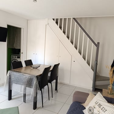 Le rez-de-chaussée comprend un séjour lumineux, une cuisine entièrement équipée et un salon confortable avec un canapé-lit. Une salle d'eau avec WC équipée d'une machine à laver.
